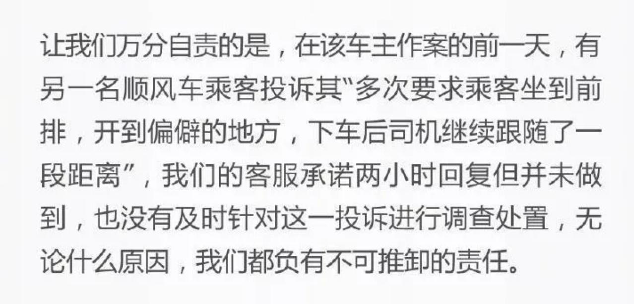 滴滴扑闪着无辜的大眼睛在公开信里说,“无论法律上平台是否有责,以及应当承担多少责任,我们都承诺给平台上发生刑事案件的受害者三倍赔偿。”
