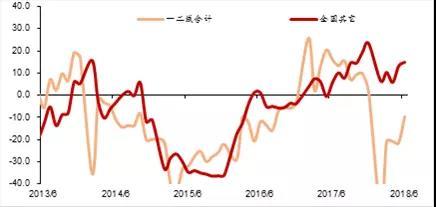 而中小城市房地产投资高增长的主要推力依然来自土地成交的活跃。今年上半年一二线土地购置面积同比减少了近10%,而全国其它城市土地购置面积依然保持了15%的高增长。