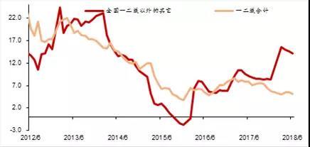 其次在投资端,大中城市和小城市房地产投资增速也出现背离。本轮房地产投资从2016年初开始触底反弹,但调控政策收紧后全国房地产销售逐步降温,一二线城市房地产投资增速从2017年开始下滑,截至今年6月末已经降至6.2%。但是一二线以外的中小城市房地产投资却一路高歌猛进,当前已经达到14%的高增长。