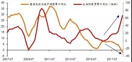 那么房地产投资为何高增长呢?其实看一下投资结构就会一目了然。房地产投资主要包括两块,一块是建筑安装投资,另一块是土地购置费。事实上从2017年初以来建筑安装投资增速就一直在大幅下滑,今年前七个月同比下降了4.1%。而土地购置费增速则一直在走高,前七个月同比增幅高达72%,是推升房地产投资整体增速的主力。