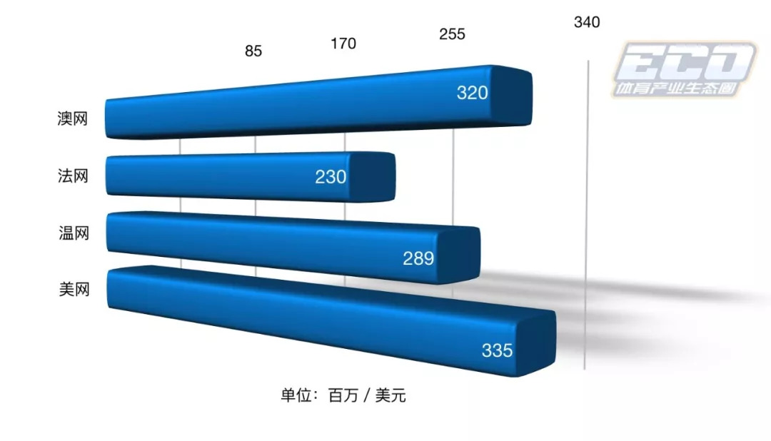 先来看下2017年四大满贯的收入对比,让大家心里有个底儿,下面我们来逐一分析。