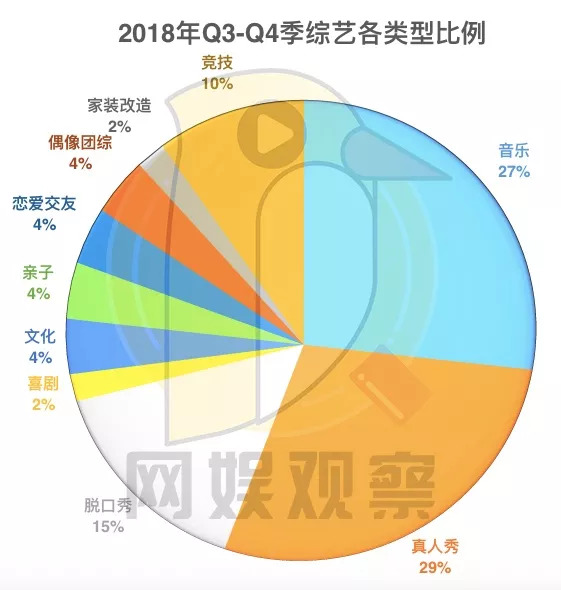 从Q3-Q4季综艺各类型比例来看,综艺市场下半年音乐与真人秀成为主打。前者的垂直细分越发明显,二次元 、流行、说唱、电音均有涉及。