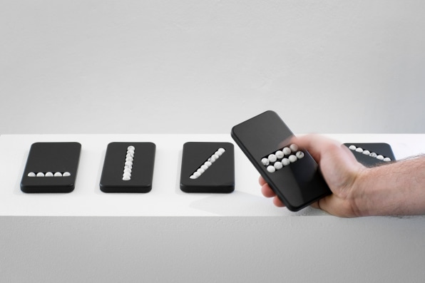 去年,设计师施林格(Klemens Schillinger)开发了一款设备,“替代手机”,大小和一般的智能手机差不多,但是“屏幕”上只有一些石珠子。这些珠子的排列经过设计,模拟手机上的操作,可以做点击和各个方向滑动的动作。