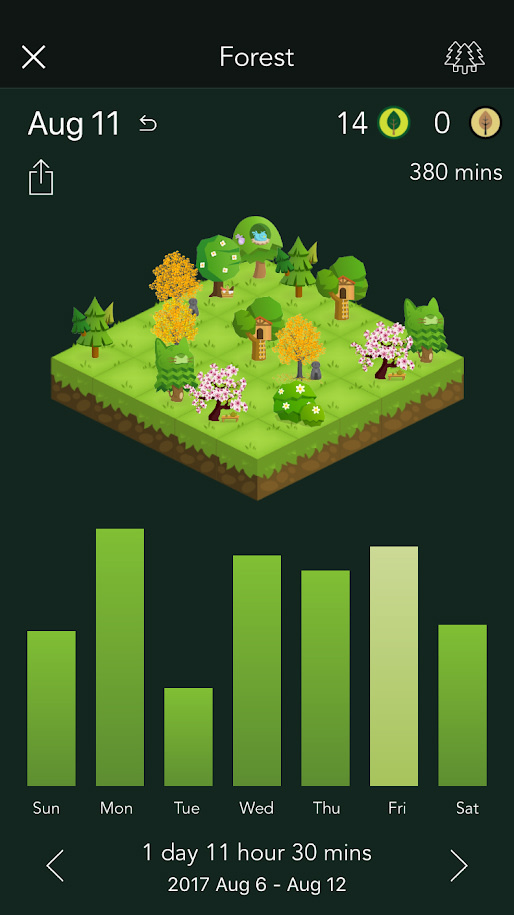 还有一个应用叫Forest。你可以在应用上设置任意你想专心学习或者做事的时间段,完成了之后,会在当日的土地上种下一棵树。每次你想拿起手机放纵一下的时候,你就会看到一个成长中的树,和一些鼓励的话语,如果你不听劝,还是打开社交媒体刷起来,树就会死去。一天下来,如果每个时间段你都能集中精神,就会收获一片繁茂的森林,每棵树都是你集中注意力的来的成就。