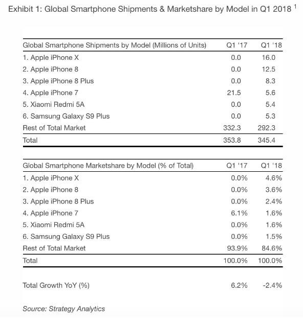 2018年Q1全球智能手机出货量和市场份额(来源:Strategy Analytics )