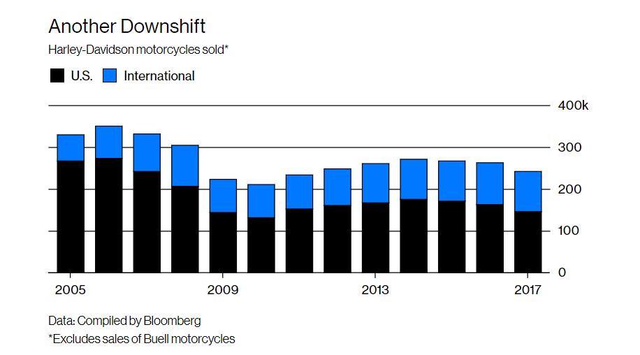 与此同时,泰国(关税为60 % )、印度( 50 % )和中国( 30 % )等国家的高额进口关税削弱了有希望的海外需求。2011年,哈雷在印度开了一家装配厂。泰国也是如此。“我们在亚洲有巨大的机会,但我们需要负担得起,”库姆比尔说。她说,泰国工厂将为中国和东南亚国家联盟的10个国家提供服务,“绕过一些限制——我不应该说‘绕过’——在该地区适当生产,这样我们就不用缴纳关税了”去年,特朗普似乎理解了这种经济逻辑。在2017年2月对国会的讲话中,他提到了他与莱瓦蒂奇和其他哈雷公司高管的会面。“他们甚至没有抱怨地告诉我,与其他国家做生意很困难,因为他们对我们的货物征收如此高的税率。”