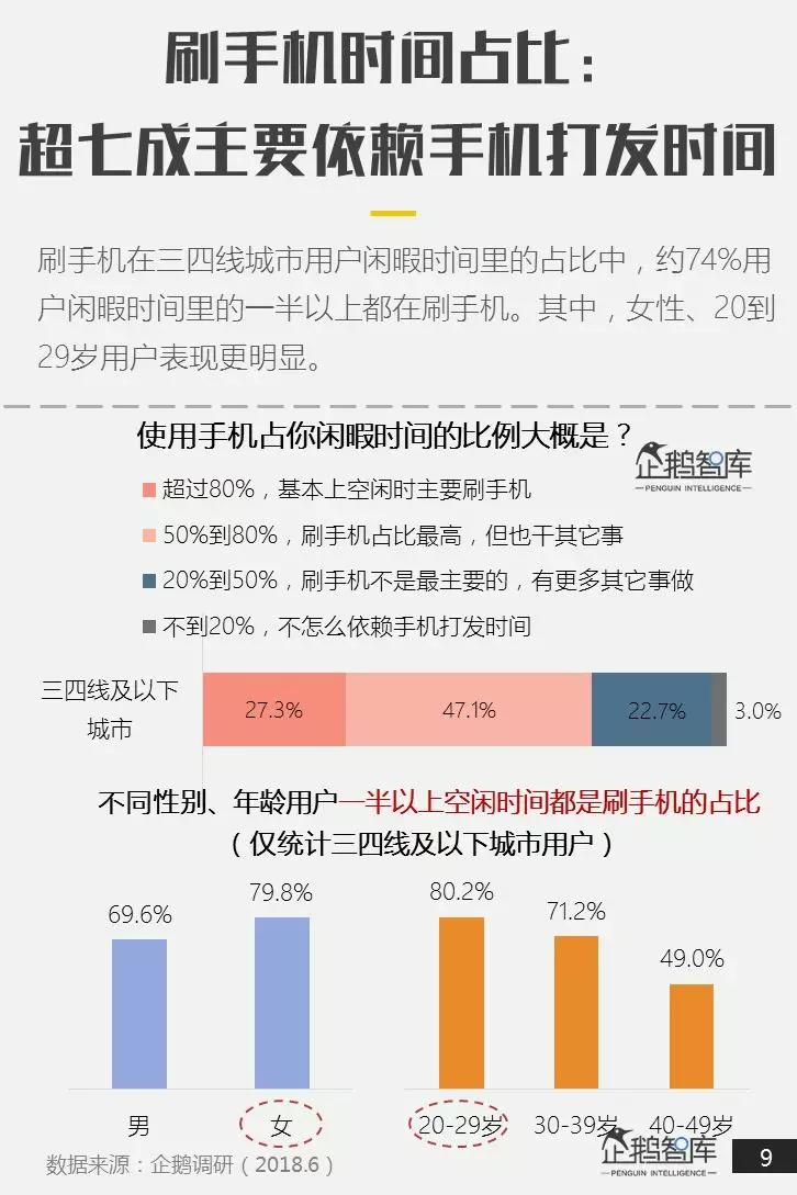为此,企鹅智库旗下智酷研究中心,基于企鹅智库企鹅调研平台和企鹅智库产品预研中心所提供的精准数据,从三四五线城市网民的时间支配、收入支配、网上娱乐消费三方面,研究发布了这份《中国三四五线城市网民时间&金钱消费数据报告》。