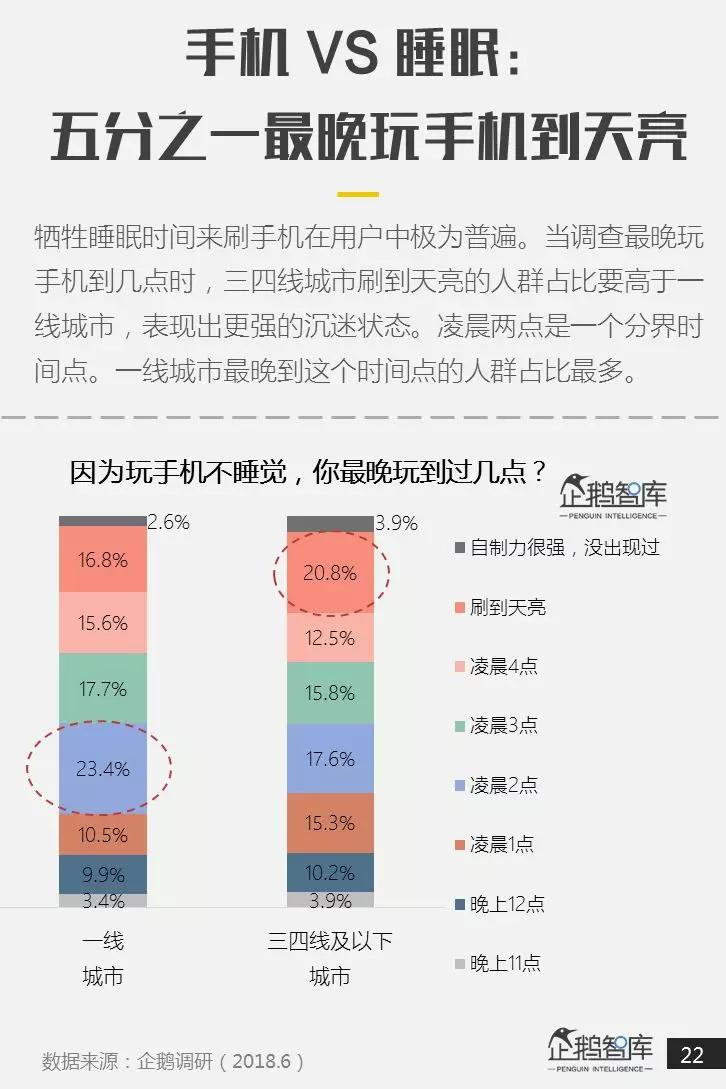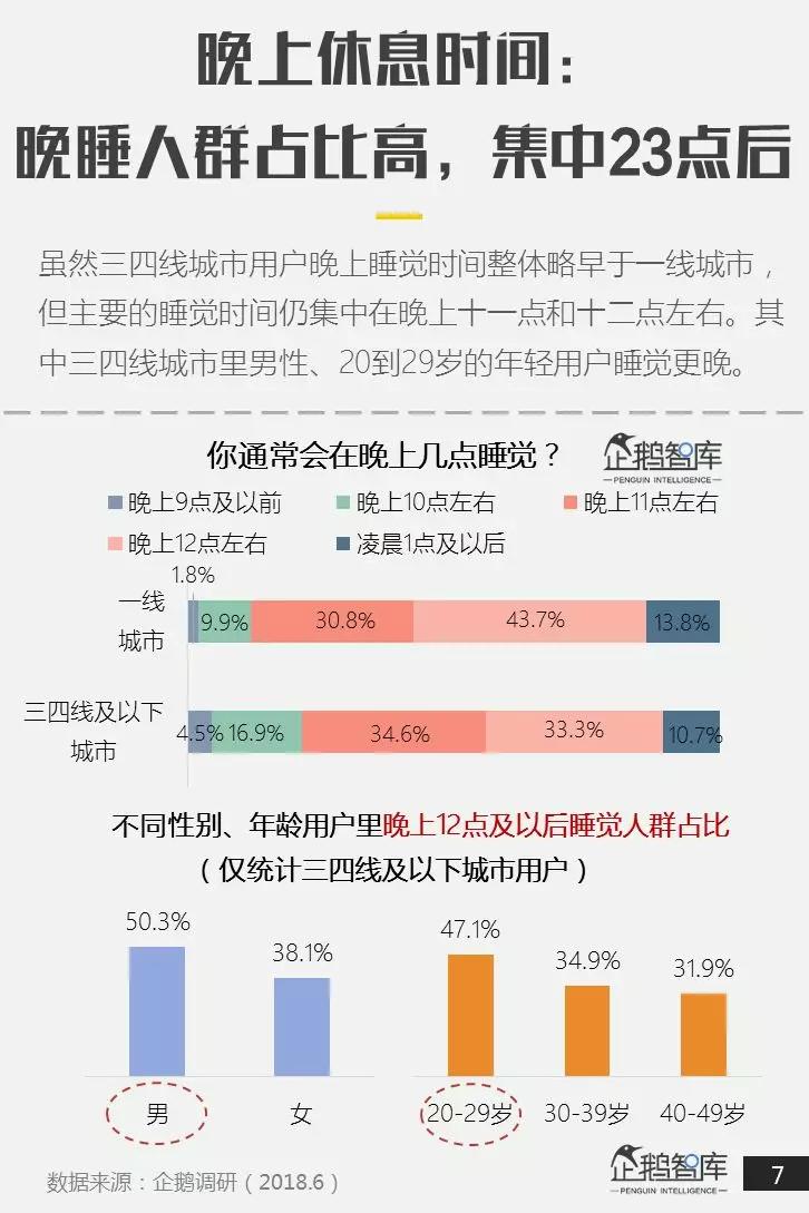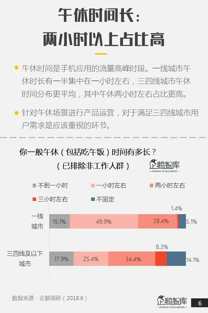 2.三四五线城市用户的上班时间整体早于一线城市。早晨8点时,已经有超过60%的人进入上班状态。