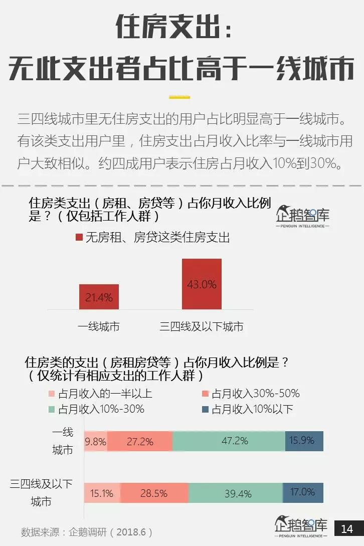 4.日常支出中,饮食和购物占比高,这一点和一线城市表现一致。但三四五线城市里,教育支出的占比要高于住房支出。