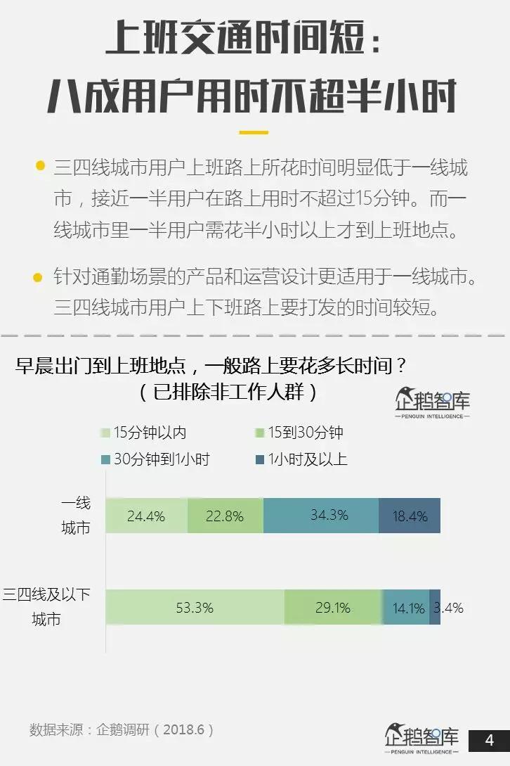 1.三四五线城市用户上班路上所花时间明显低于一线城市。接近一半的三四五线城市用户在路上用时不超过15分钟。而一线城市里一半用户需花半小时以上才到上班地点。