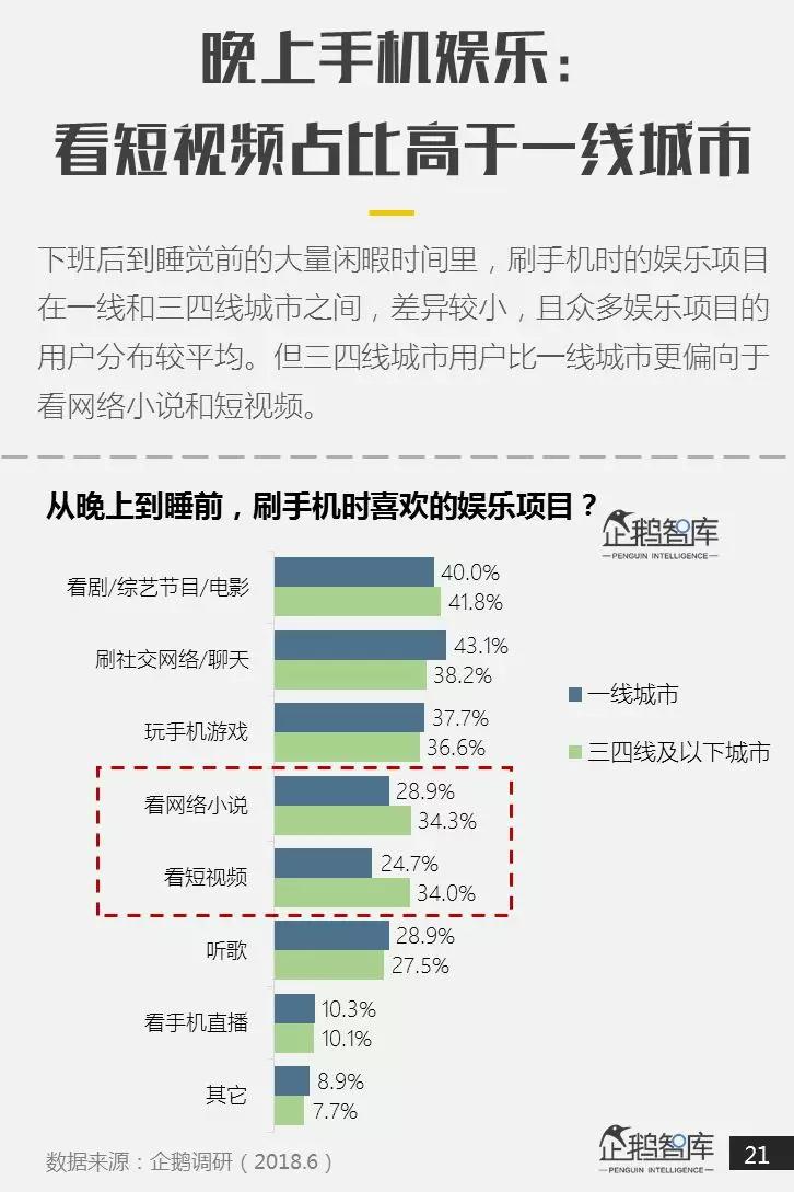 6.晚上下班回家后的手机娱乐项目里,对短视频和网络小说的喜欢程度上,三四五线城市明显高于一线城市。且三四五线愿意为网络小说付费的人群也高于一线城市。