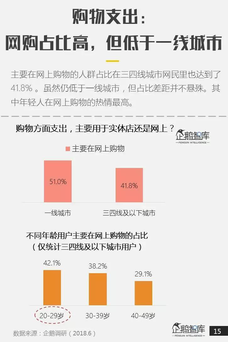 5.三四五线城市的网民中,也已经有41.8%用户表示主要在网上购物,虽然低于一线城市的51%,但整体差距并不悬殊。