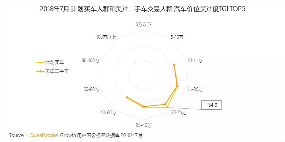相对来说,受购买力的限制,计划买车人群对价位在15-40万的汽车较为关注,关注二手车交易人群则对价位在10-25万的汽车更感兴趣。