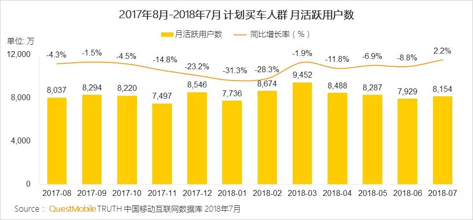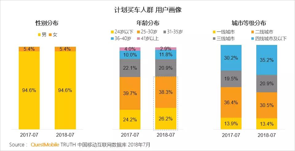 30岁以下年轻用户正处于适婚阶段,汽车也已成为结婚的标配。QuestMobile数据显示,2018年7月计划买车人群中30岁以下的用户占比达64.5%,同比增长160万。