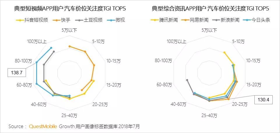 典型短视频APP用户的汽车价位关注较为分散,微视、土豆视频的用户关注的汽车价位较高,抖音、快手的用户则关注中低价位的汽车较多。