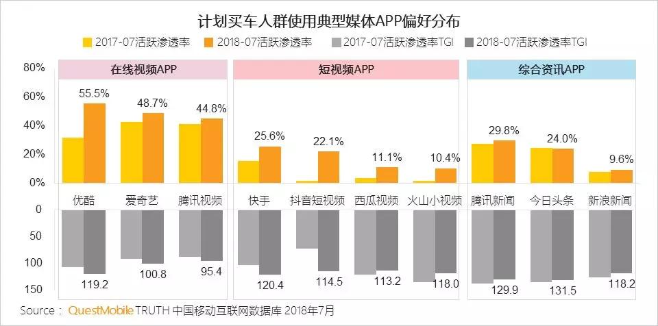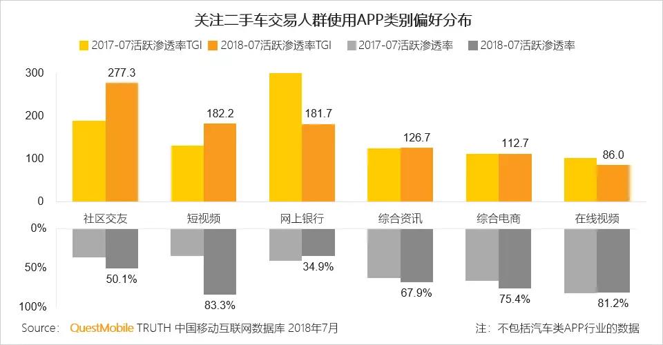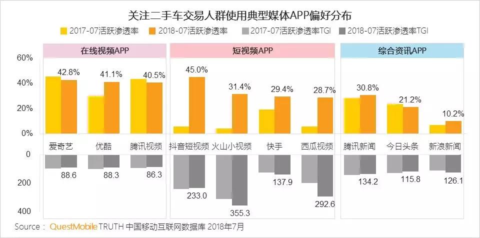 短视频在关注二手车交易人群的渗透率同比快速增长,偏好的APP有抖音、火山、西瓜、快手