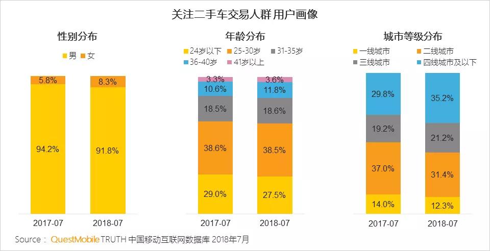 2017年7月,新《汽车管理销售办法》正式实施,降低了汽车销售公司的门槛,三四线城市的消费者将拥有更多品牌与服务的选择,这会满足三四线城市对汽车日益增长的需求,引导车辆更新换代,在促进新车及二手车消费层面将起到积极的作用。QuestMobile数据显示,关注二手车交易人群中三四线及以下城市用户规模达716万,同比增长48.9%。