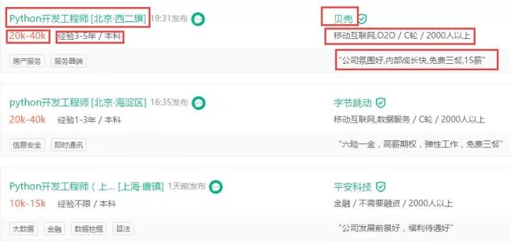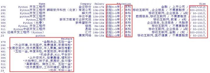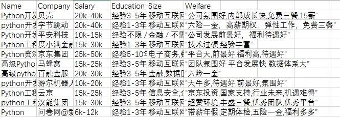 我们抓取的信息包括Python岗位名称、公司名称、薪资、工作经验、学历、公司规模、公司福利。