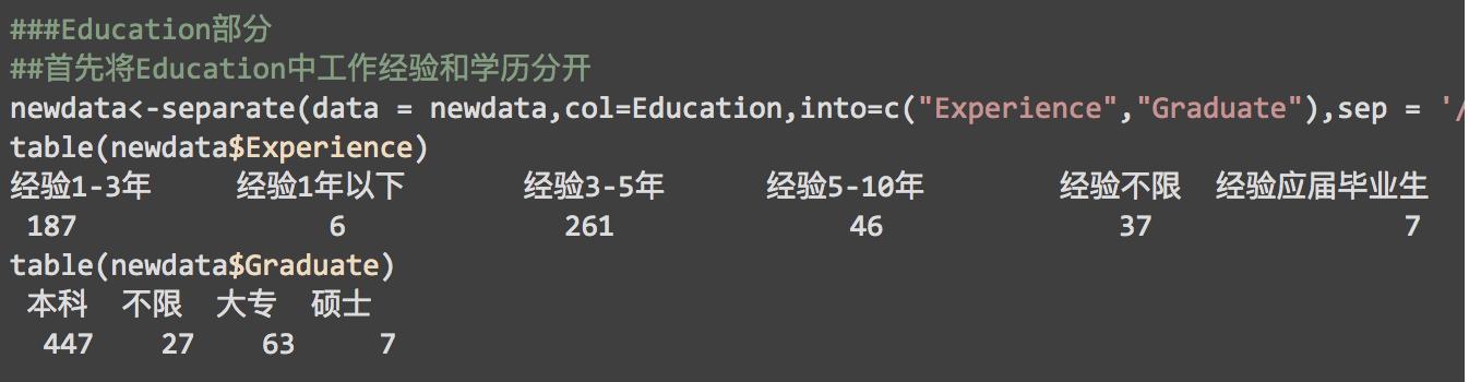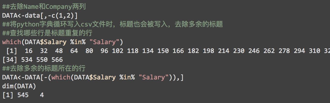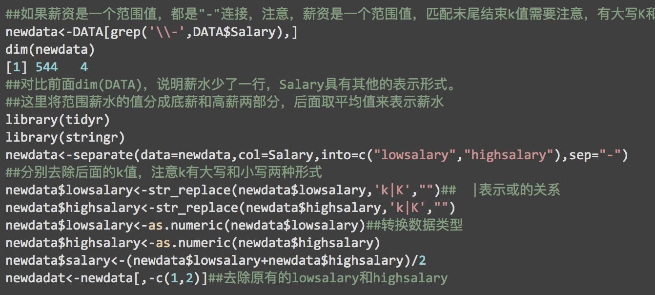 变量Salary一般都是范围值,用“-”连接,但是不排除有XXK以上,例如10k以上这种表示形式,或者其他形式,这里需要处理一下。