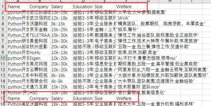 在抓取过程中,由于将python字典循环写入csv文件,因此列名也被循环写在csv文件中。