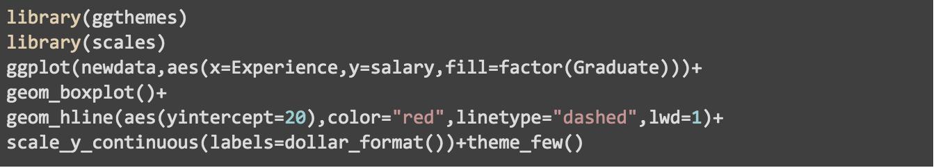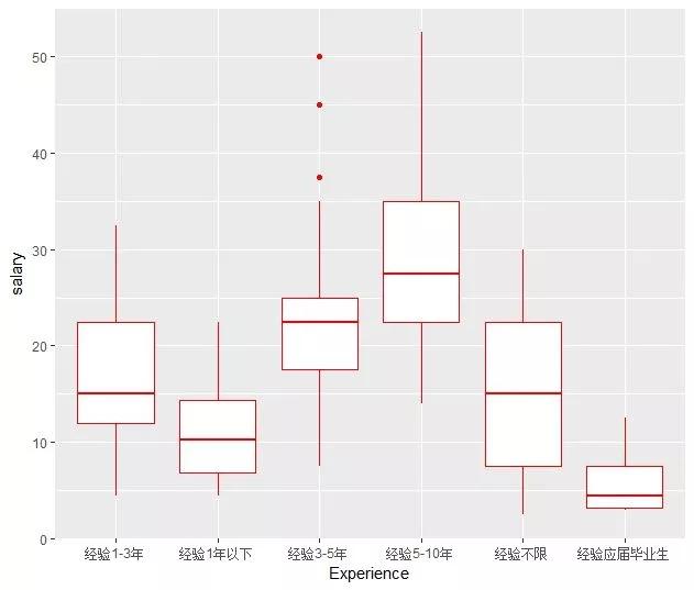 ggplot(newdata,aes(x=Experience,y=salary))+geom_boxplot(col="red")