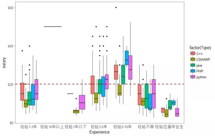 对于不同工作经验,不同编程语言平均薪水还是有较大的差异。