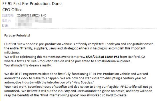 这封由FF首席执行官办公室发出的内部邮件显示:“我们将在明天(2018年8月28日)上午11点在美国加州汉福德庆祝这一重大事件。届时,首台FF 91预量产车将在这里进行小规模的内部展示。”