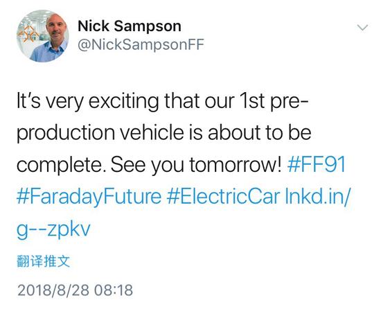 FF产品高级副总裁Nick Sampson也通过他的推特发布了一段FF 91预量产车的视频。视频内容显示,汉福德工厂内,工人们正在安装FF 91首台预量产车。Nick Sampson说:“我们的首台预量产车即将完工,这非常令人兴奋。明天见!”据悉,贾跃亭也将参加活动,并现场向制造和研发部门的团队颁发奖品。
