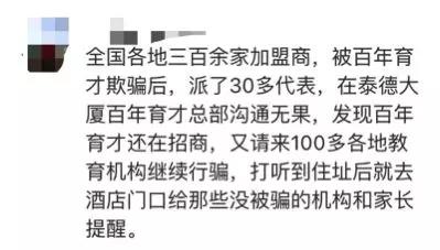 据知情人透露,百年育才在全国各地有三百余家加盟商,其中有超过100家加盟商有意向进行维权,此次,选派了30多家代理商到总部进行沟通。
