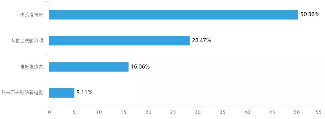 以电影为例,除了调查暑期档电影市场情况之外,我们也从“看电影”本身出发进行了调查,在“对于去电影院看电影的态度”一问中,选择“佛系看电影”的人数过半,占到50.36%,有固定观影习惯的占28.47%,还有5.11%的人选择了“从来不去影院看电影”。