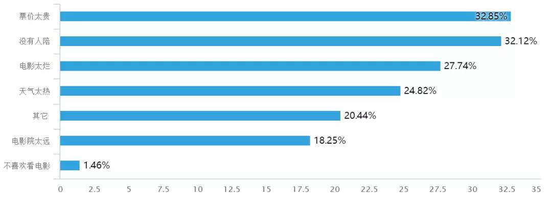 同时,我们也对当下大众对于电影院态度进行了调查,在拒绝到影院看电影的理由当中,32.85%的人选择了票价太贵,32.12%的人是因为没有人陪,顺次排位的理由还有电影太烂、天气太热、电影院太远等。