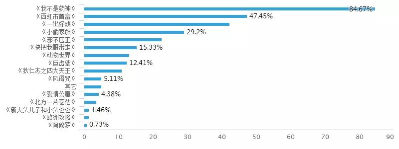 针对今年暑期档的良好表现,此次问卷调查中也有明显的呼应。比如,在问到观众心里中今年暑期档排名前三的电影时,收获观众最高支持的同样是现象级影片《我不是药神》,影片占比高达84.67%。开心麻花的又一作品《西虹市首富》则凭借47.45%的占比排名第二,看来开心麻花招牌的影响力仍然强大,第三则是黄渤的《一出好戏》,占比42.34%。除此之外,日本文艺电影《小偷家族》以29.2%的支持率排名第四,同样令人惊喜。