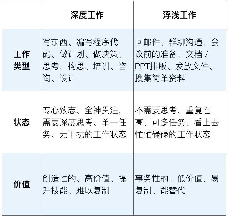 你看这里面有三个关键词,第一个叫做无干扰,第二个叫做专注,就是聚焦于一个事情,第三个才是需要高脑力活动参与的工作,这些工作才能够创造价值,提升技能,而且主要是很难以被复制。反过来说,什么叫浮浅工作?那就是不需要投入很多思考,经常被干扰,常常被打断,工作目标很散乱,没什么价值,可替代性非常强的工作。