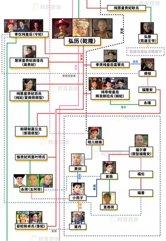 “卫龙大旗”挥舞,“傅璎cp”一去不复返,延禧中的藕断丝连不得不让观众联想到《还珠格格》中令妃与傅家交好的渊源。不过这届优秀的剧迷总能出其不意,“清宫剧串联图”越做越大,直至画出一副清宫言情宇宙皇室图鉴,在减少观众观剧梳理人物关系精力的同时,也吸引相关粉丝对比好奇心观剧。