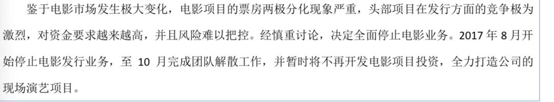 2017年8月开始停止电影发行业务,至10月完成团队解散工作,并暂时将不再开发电影项目投资,全力打造公司的现场演艺项目。