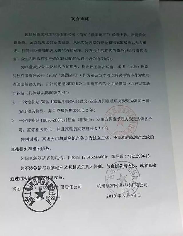 鼎家贴出的告示中称,部分合同可以以短信形式终止,对于鼎家造成的损失,业主和租客可通过诉讼途径解决。此外,接管方寓团表示需要延长租赁期3~5年才能得到补贴。
