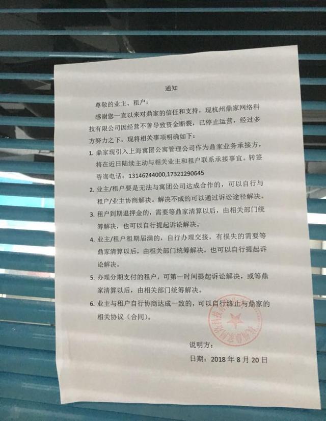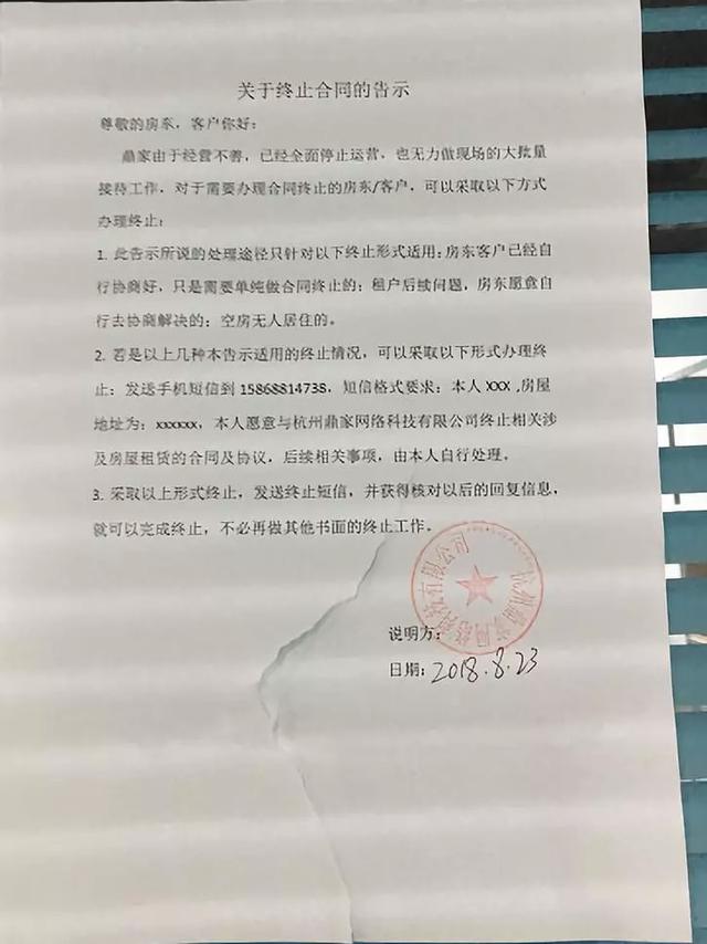 鼎家破产倒闭的传闻一直不断。8月2日,公司法人特发声明承认资金困难,并承诺会妥善解决。15日,总部人去楼空,只留下散乱一地的文件。20日,鼎家宣布因经营不善导致资金断裂,停止运营,寓团将成为业务承接方。