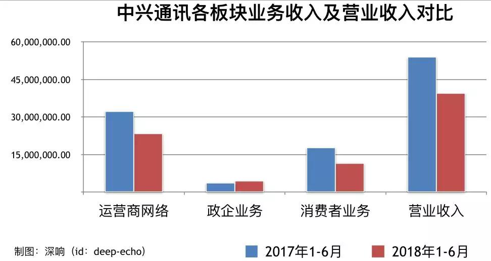 这是首份体现美国出口禁令阴影的财报。2018年上半年,中兴通讯营业收入394.34亿元人民币,同比减少26.99%,财报称主要是运营商网络、消费者业务营业收入较上年同期减少所致。
