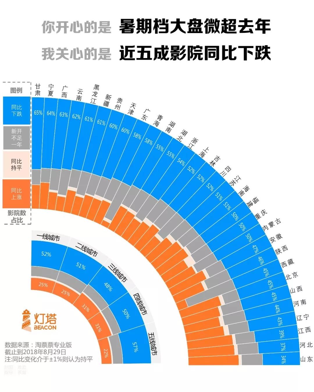 实际上,影院的经营形式可能比数据体现出来的还要糟糕。在凡影和灯塔合作的暑期档报告之中可以看到,今年暑期档全国有五成影院的经营业绩同比下跌,在不少省份只有25%左右的影院票房还能上涨,部分省份这个数字更是低到10%。