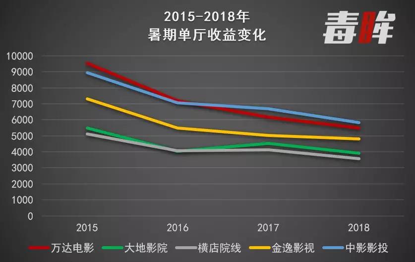 从暑期档单日单厅收益的数据更能看出几大影投、院线经营业绩的直线下滑。全国影投的平均单日单厅收益在2014年时能达到3600元,近两年始终在3000元左右徘徊,但是几个大的影投院线单厅收益在这几年下滑都非常快。万达电影暑期档的单厅收益从由2015年的9518元已经下滑到2018年的5464元,下降幅度超过40%;金逸影视也从2015年的7320元下降到如今的5026元,下降幅度超过30%。