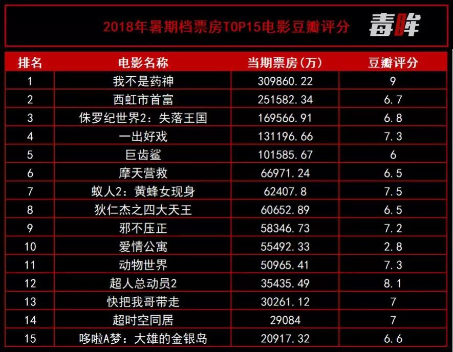 今年暑期档票房成绩前15名中,只有一部《爱情公寓》在豆瓣评分是不及格的分数,剩下14部都超过了6分,其中还有8部超过了7分。口碑效应在今年夏天显现的特别快,烂片可能会面临影院一日游就被影院经理放弃(点此阅读:烂片死于2018年的夏天)。