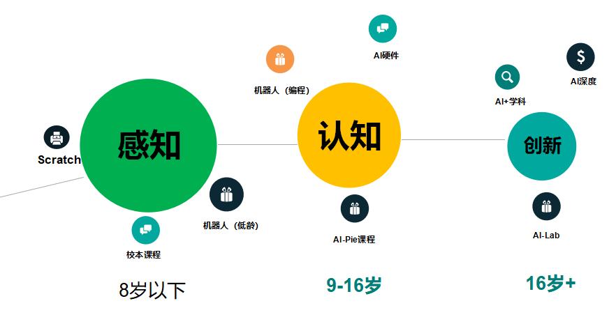 一、进校课程:以选修课、校本课程为主要载体的 AI 课程成长体系。主要依靠团队自身的政府资源,将线上课程直接接入当地学校,解决在校生计算机编程课程的应试需求。