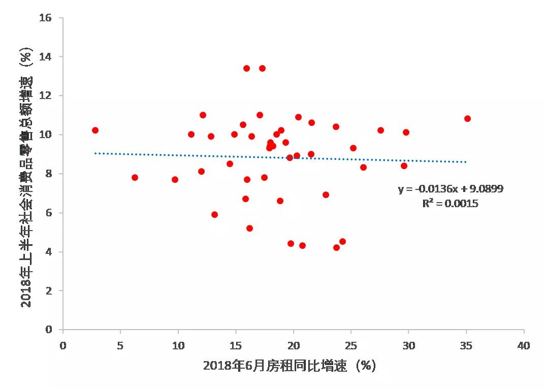 但房租上涨,对消费的整体影响有限。考虑到数据的可得性,我们统计了44个城市的今年6月房租同比增速、上半年社会消费品零售总额增速。发现房租上涨对消费只有微弱的影响,在统计学层面上看这种影响可以忽略不计。