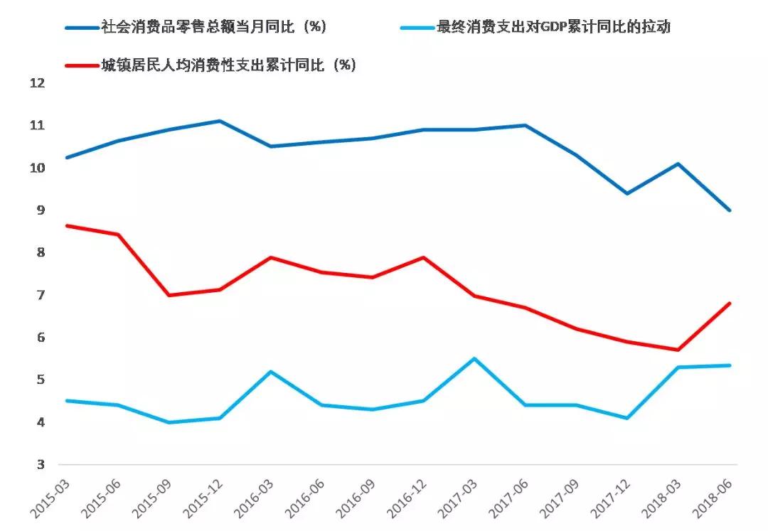 由于GDP口径最终消费支出同比只有年度数据,我们不能直接观察到今年上半年最终消费支出的增速。但今年一、二季度最终消费支出对GDP同比的拉动分别为5.3%和5.4%,比2017年后面三个季度高了不少,侧面反映了消费,尤其是服务消费很强劲。
