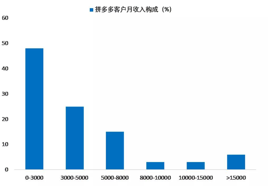 拼多多客户月收入分布,半数在3000元以下。资料来源:极光大数据