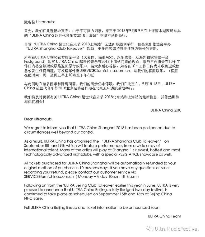 本以为只是运气不好,时机不对。可原定于今年九月分举办的Ultra China上海站在已经卖完两轮预售票的情况下,仍然步履维艰。8月21日,某电子音乐自媒体大号流出消息,Ultra上海站确认取消不排除延期或更换场地再举行;8月31日,Ultra官方微信正式宣布上海站延期,同样举行club takeover 活动。
