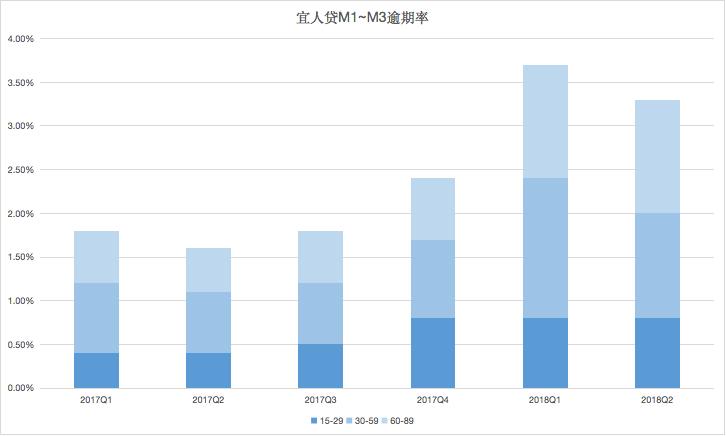 本季度,宜人贷15~29、30~59、60~89逾期率分别为0.8%、1.2%、1.3%,逾期率水平环比保持平稳,连续三个季度15-29天逾期率为0.8%,比去年同期的0.4%上涨0.4个百分点,30-59天逾期率比上一季度有所下降,60-89天逾期率与上一季度持平。