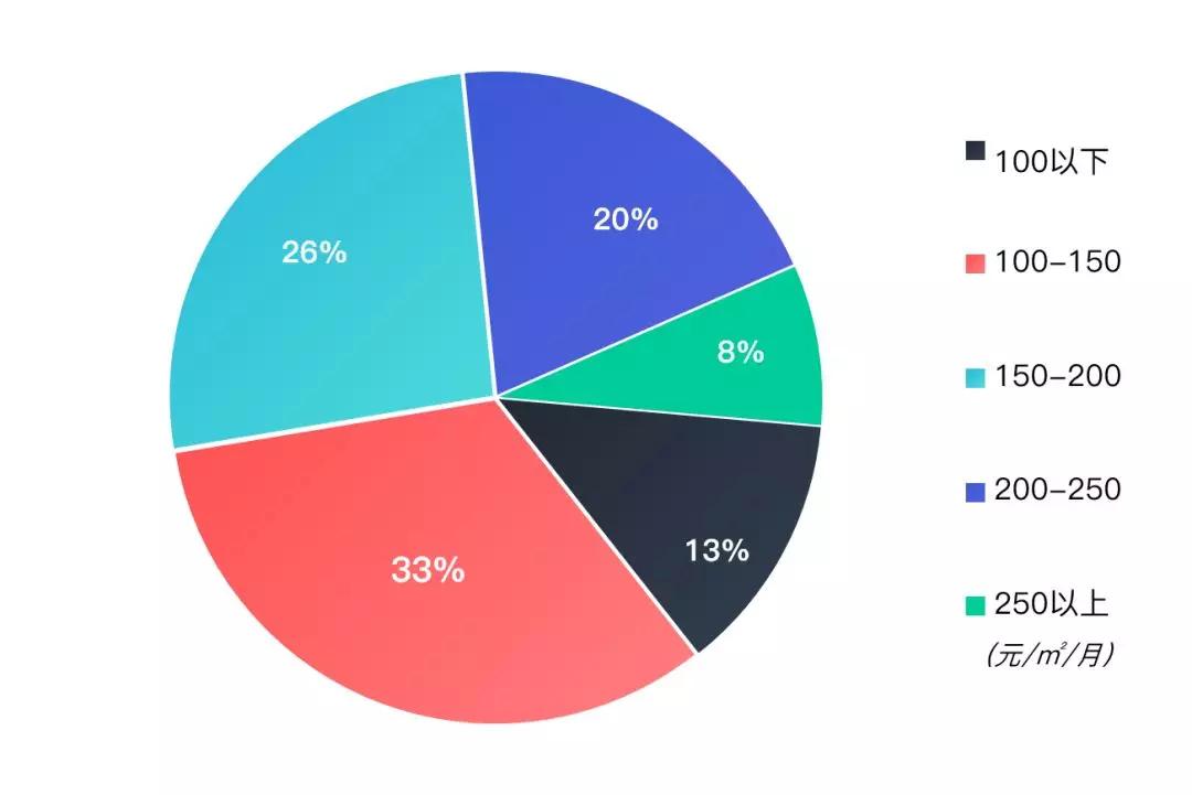 从价格分布来看,长租公寓的租金普遍高于普通住宅。租金低于100元/㎡/月的仅占13%,主流价格区间是100-200元/㎡/月,还有约1/4的房源租金在200元/㎡/月以上。