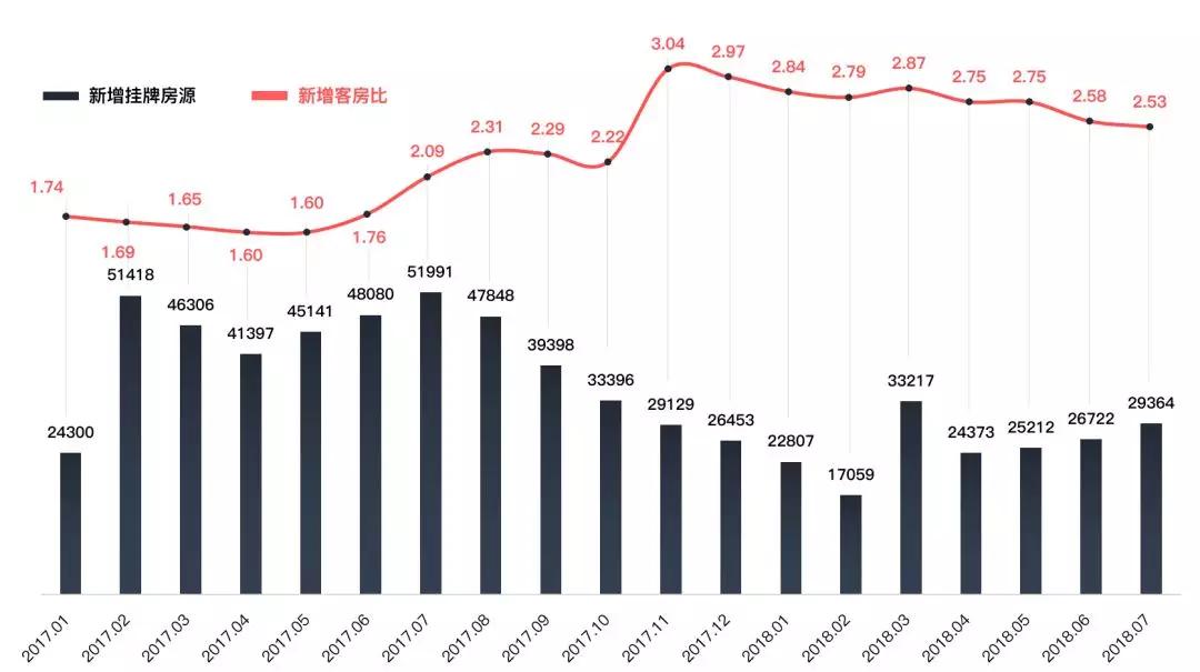 贝壳研究院数据显示,2017年11月之前,北京新增挂牌房源量长期维持在月均3万套以上的水平,西红门大火之后,在群租房、N+1整改的影响下,新增房源量不断缩减,最低时月新增房源甚至不足两万套。供应收紧直接导致客房比居高不下,一套房经常是2-3个人抢。