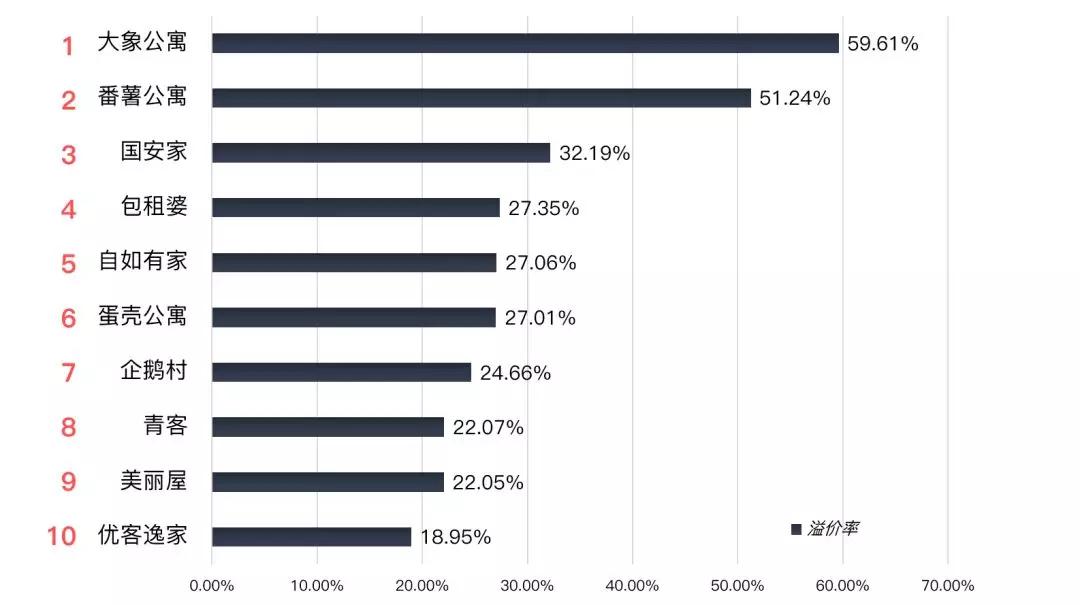 从溢价情况来看,集中式公寓要普遍高于分散式长租公寓。集中式公寓中溢价率最高的是龙湖旗下的冠寓,溢价可达220%,而分散式公寓中溢价排名第一的大象公寓,溢价仅59.63%。